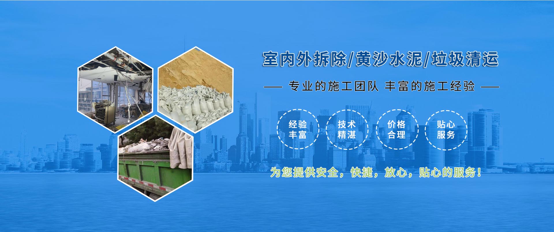 长期提供室内外拆除、黄沙水泥、垃圾清运等服务,经验丰富,